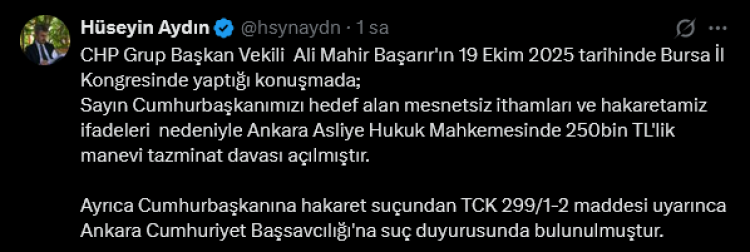 Cumhurbaşkanı Erdoğan’ın avukatı Hüseyin Aydın, sosyal medya hesabından yaptığı paylaşımda, Başarır’ın konuşmasında “Cumhurbaşkanını hedef alan mesnetsiz ithamlar ve hakaretamiz ifadeler” kullandığını belirterek, Ankara Asliye Hukuk Mahkemesi’nde 250 bin TL tutarında manevi tazminat davası açıldığını duyurdu.