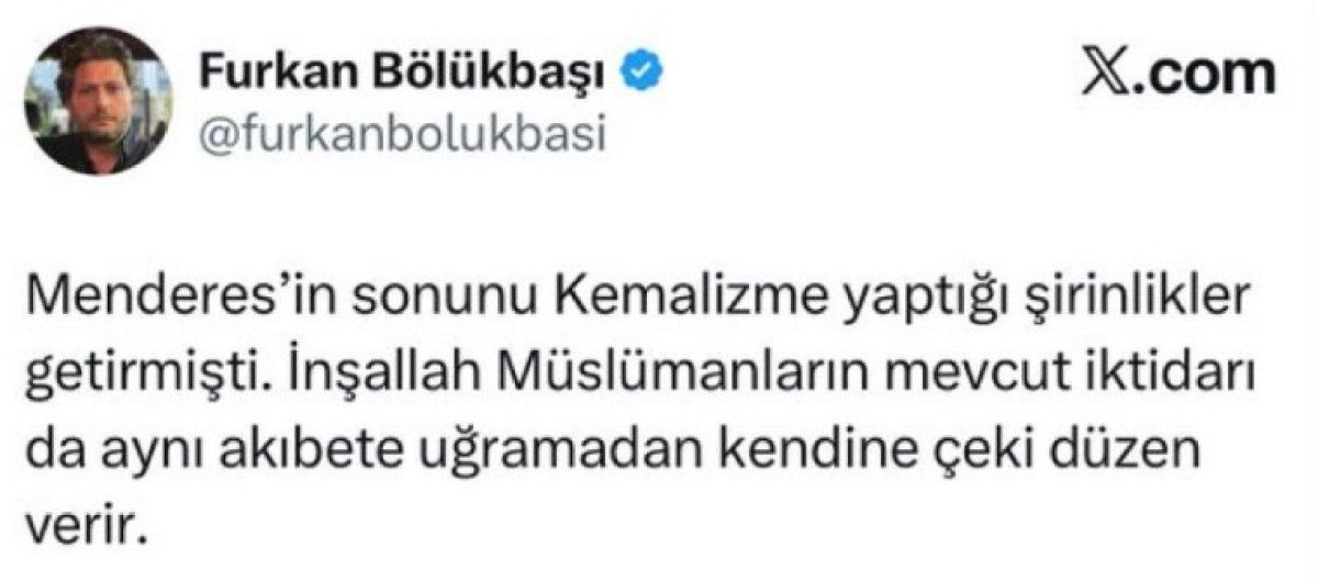 37 yaşındaki Bölükbaşı, bir paylaşımında, “Menderes’in sonunu Kemalizme yaptığı şirinlikler getirmişti. İnşallah Müslümanların mevcut iktidarı da aynı akıbete uğramadan kendine çeki düzen verir” ifadelerini kullanmıştı.