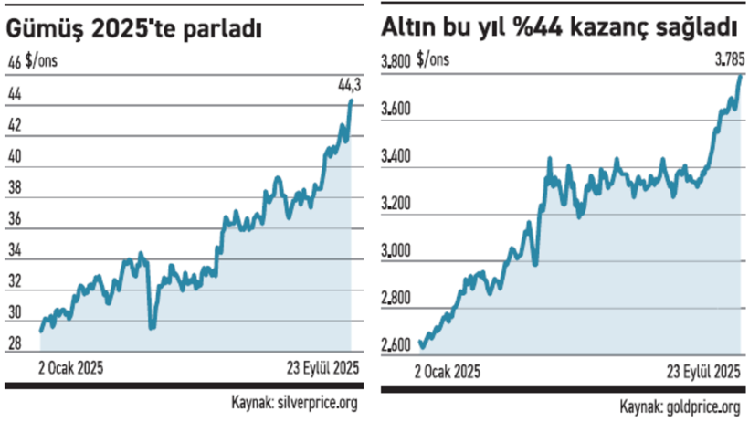 Fed’in faiz indirimi ve zayıflayan dolar, altın ve gümüşte tarihi ralliyi tetikliyor. Altın 3.785 dolarla rekor kırarken, gümüş 14 yılın en yüksek seviyesine ulaştı. Uzmanlar, gümüşün 50 dolar ve altının 4.000 dolar hedefini zorlayacağını söylüyor.