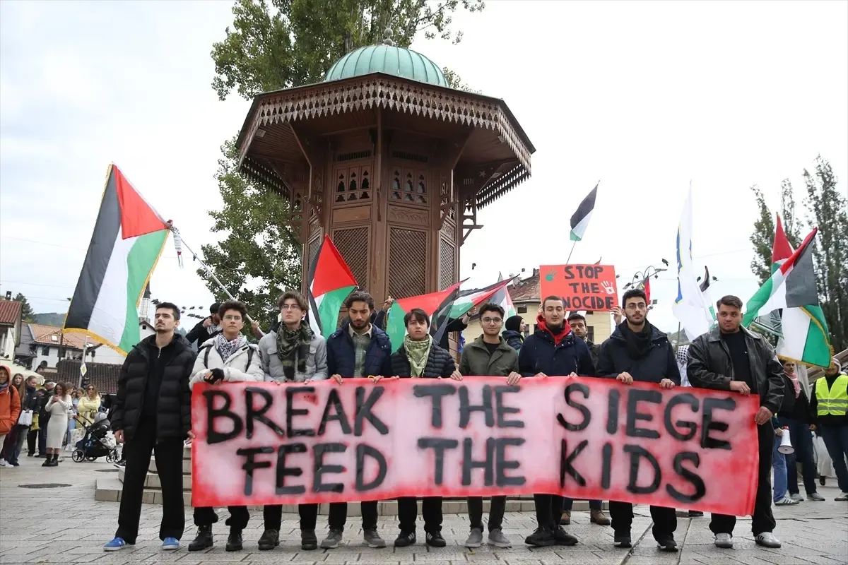 Saraybosna’nın merkezinde bulunan Sebil Çeşmesi önünde toplanan Bosna Hersekli vatandaşlar, Filistin bayrakları taşıyarak İsrail’in saldırısına maruz kalan Küresel Sumud Filosu’na destek amacıyla gösteri düzenledi.