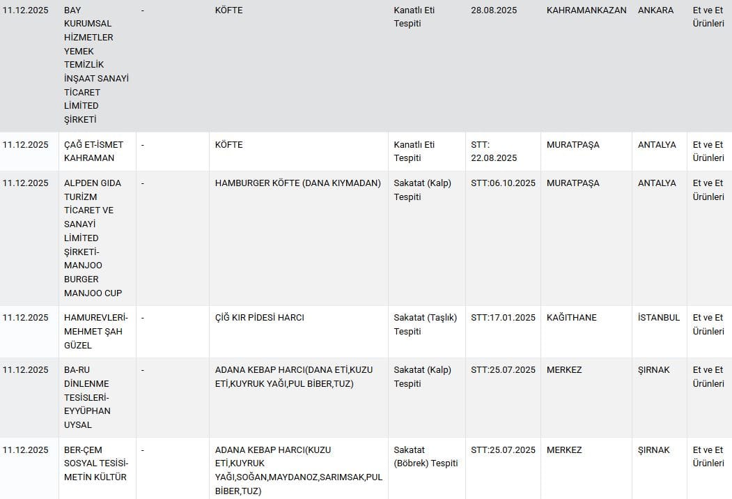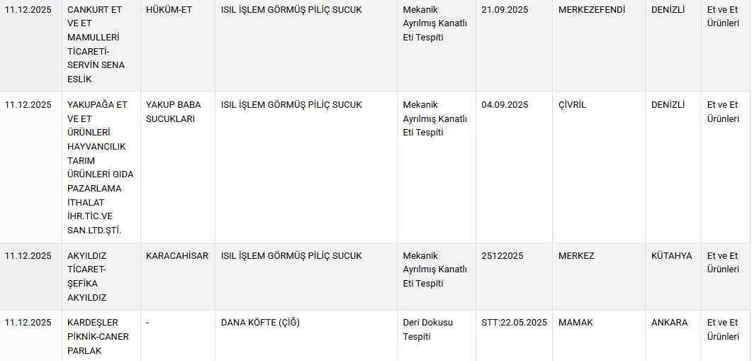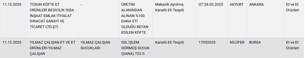 Ayrıca Ankara’nın Akyurt ilçesinde, yüzde 100 piliç eti olduğu beyan edilen köftede, mekanik ayrılmış kanatlı et bulunduğu tespit edildi.
